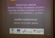Danas je u Hrvatskom domu u Slatini održana završna konferencija projekta „Energetske obnove zgrade Pučkog otvorenog učilišta i Gradske knjižnice i čitaonice Slatina“ uz visoke standarde zdravstvene zaštite prema preporukama Stožera civilne zaštite Republike Hrvatske.