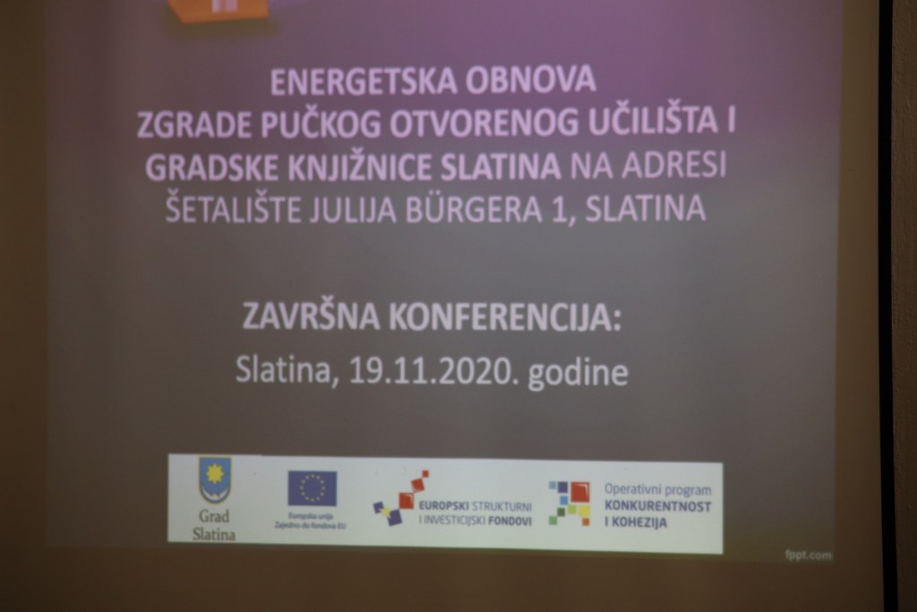 Danas je u Hrvatskom domu u Slatini održana završna konferencija projekta „Energetske obnove zgrade Pučkog otvorenog učilišta i Gradske knjižnice i čitaonice Slatina“ uz visoke standarde zdravstvene zaštite prema preporukama Stožera civilne zaštite Republike Hrvatske.