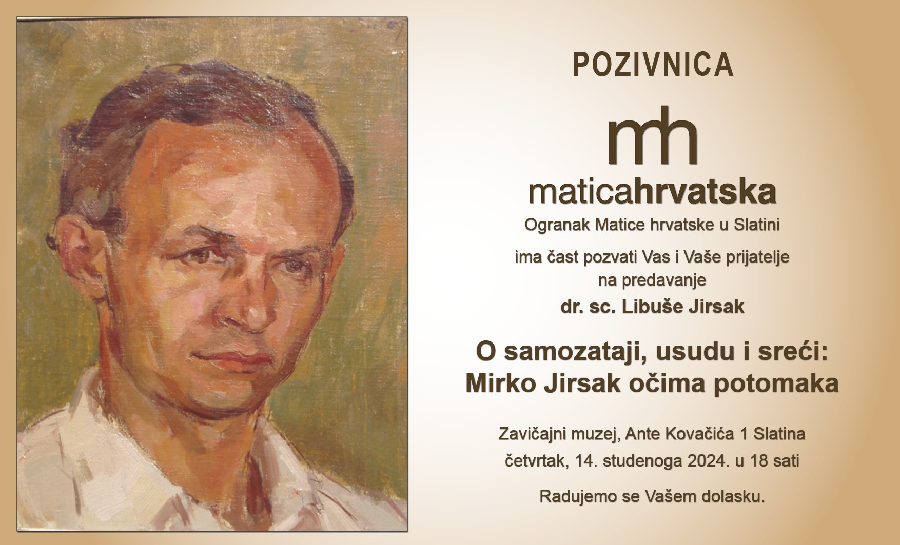 Ogranak Matice hrvatske u Slatini organizira predavanje dr. sc. Libuše Jirsak O samozataji, usudu i sreći: Mirko Jirsak očima potomaka.