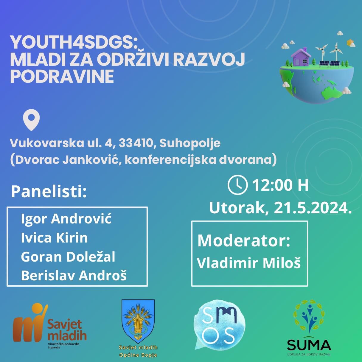 U utorak, 21. svibnja 2024. u Suhopolju će se održati okrugli stol na temu “Mladi za održivi razvoj Podravine” u sklopu projekta YOUTH4SDGs kojeg provodi Udruga SUMA.