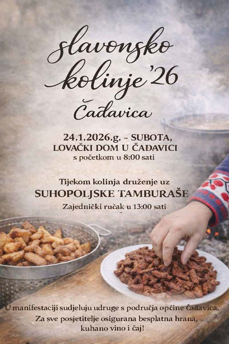 Općina Čađavica po osmi put organizira tradicionalno „Slavonsko kolinje“ koje će se održati u subotu, 24. siječnja 2026. godine u Čađavici.