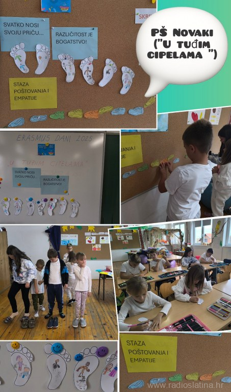 Učenici Područne škole Novaki na satu razrednika sudjelovali su u radionici „U tuđim cipelama“. Zamjenom papuča i razgovorom s osobom čije su papuče obuli, učili su o različitostima, empatiji i međusobnom razumijevanju. Na kraju su simbolično izradili papirnata „stopala“ na kojima su zapisali što su naučili – da, iako smo svi različiti, svi jednako vrijedimo.