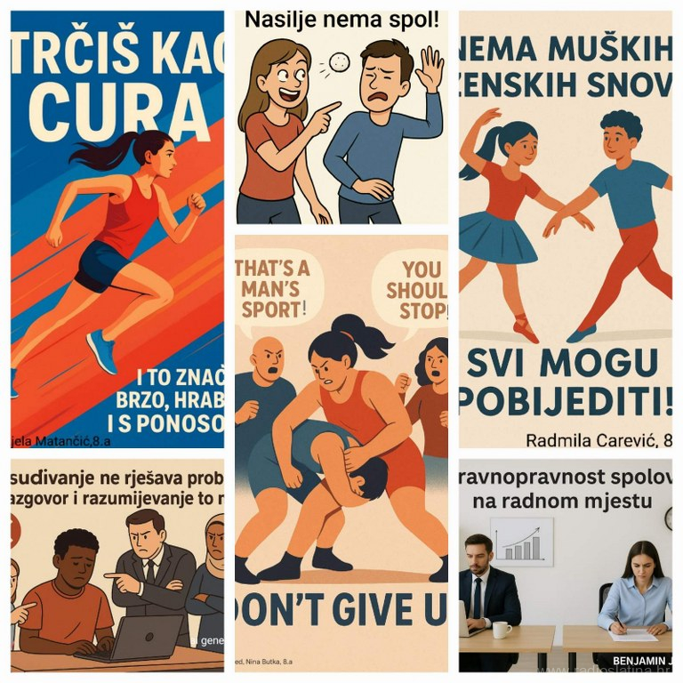 Učenici osmih razreda nakon čitanja djela Breza Slavka Kolara i Alkar Dinka Šimunovića raspravljali su o rodnim ulogama u prošlosti i sadašnjosti. Koristeći ChatGPT za generiranje ilustracija, izradili su postere kojima su istaknuli važnost rodne ravnopravnosti i jednakosti – temeljnih europskih vrijednosti.