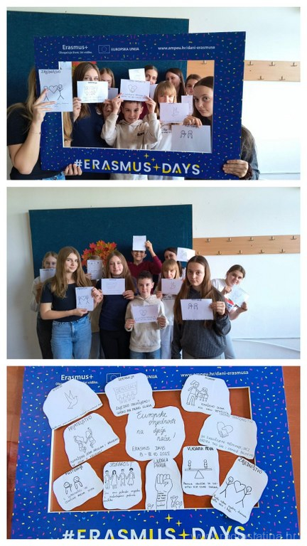 Učenici petih i sedmih razreda koji pohađaju izvannastavnu aktivnost „Pozitivno-kreativna radionica“ sudjelovali su u radionici posvećenoj europskim vrijednostima viđenima kroz dječje oči. Kroz crteže i kratke tekstove prikazali su što za njih znače sloboda, solidarnost i prijateljstvo, stvarajući zajednički „kolaž europskih vrijednosti“.