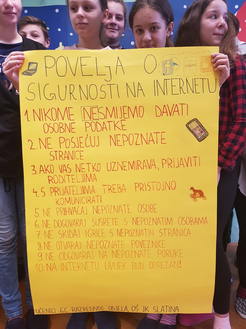 OŠ Josipa Kozarca Slatina se i ove godine pridružila obilježavanju Dana sigurnijeg interneta – događaja koji se posljednjih godina drugoga dana u drugom tjednu drugoga mjeseca obilježava diljem svijeta. Dan sigurnijeg interneta se organizira u sklopu projekta „Safer Internet Centre Croatia: Making internet a good and safe place” udruge Centra za nestalu i zlostavljanu djecu (csi.hr) kojoj je cilj zaštititi djecu od raznih oblika zlostavljanja putem interneta. Ovom se projektu svake godine pridružuje i sve više organizacija koje raznim aktivnostima pokušavaju upozoriti učenike na opasnosti interneta.