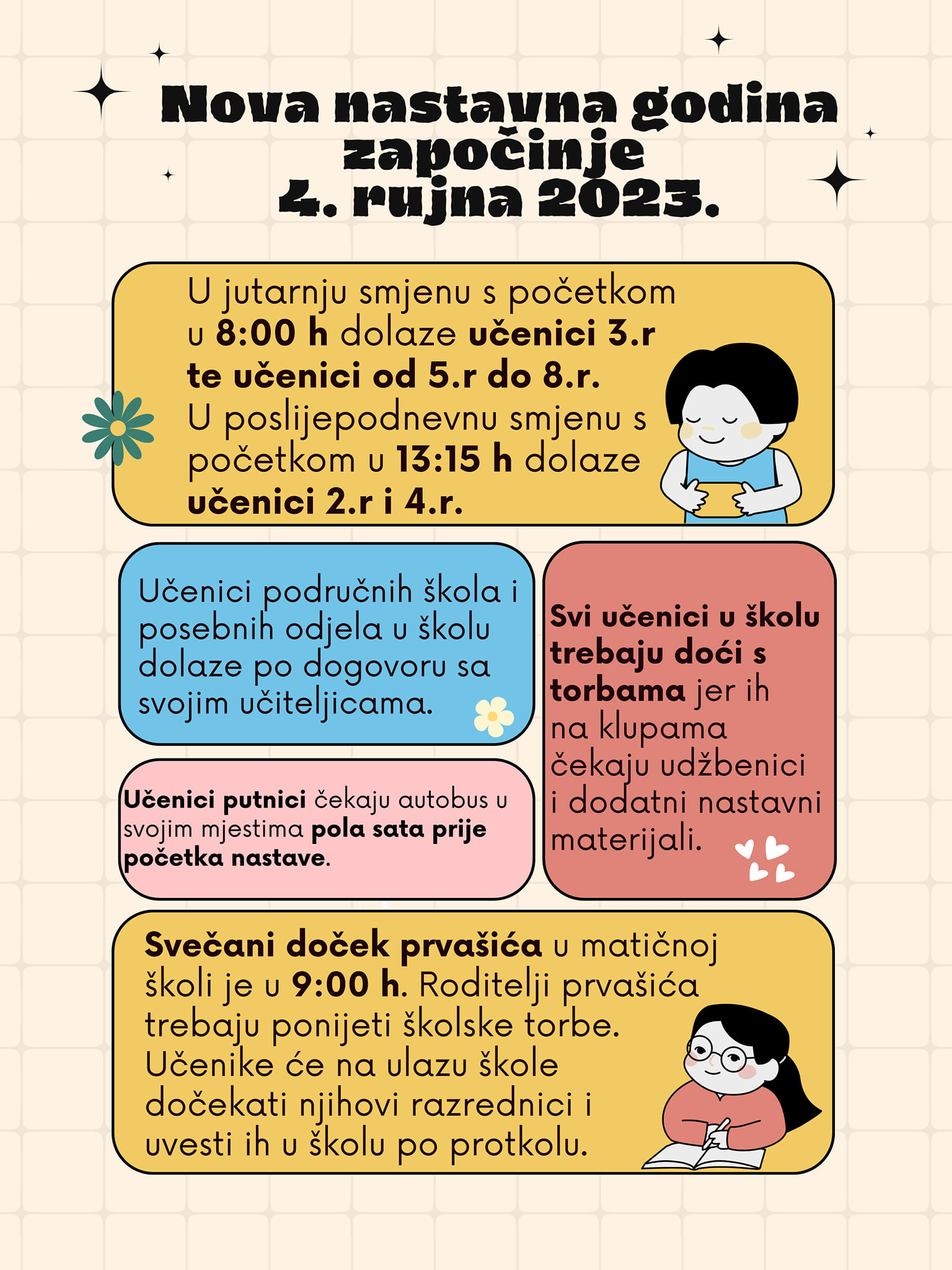 U prigodi početka nove nastavne 2023./2024. godine koja počinje u ponedjeljak, 4. rujna, Osnovna škola Eugena Kumičića Slatina oglasila se s rasporedom polaska u školu svojih učenika.