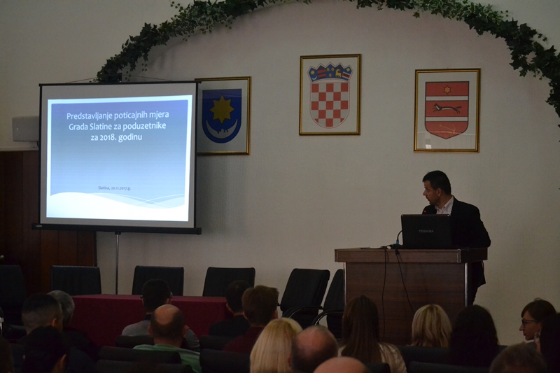 Privremeni pročelnik Upravnog odjela za razvoj grada Slatine, Marin Kokorić upoznao je prisutne s mjerama poticanja poduzetništva koje Grad Slatine ima u planu za 2018. godinu, a među kojima su i sufinanciranje novog zapošljavanja, poticanje poduzetničkih aktivnosti u poduzetničkim zonama… Konkretne mjere s točnim iznosima sufinanciranja i kriterijima će biti poznate do veljače 2018. godine do kada bi trebale biti usvojene.