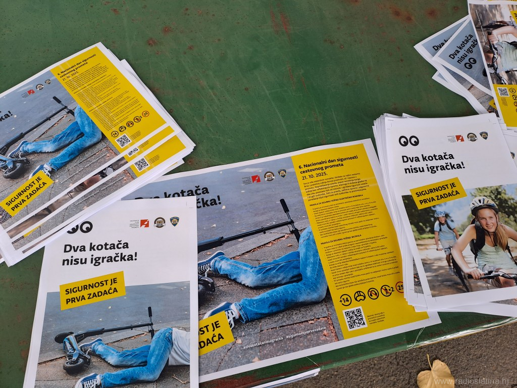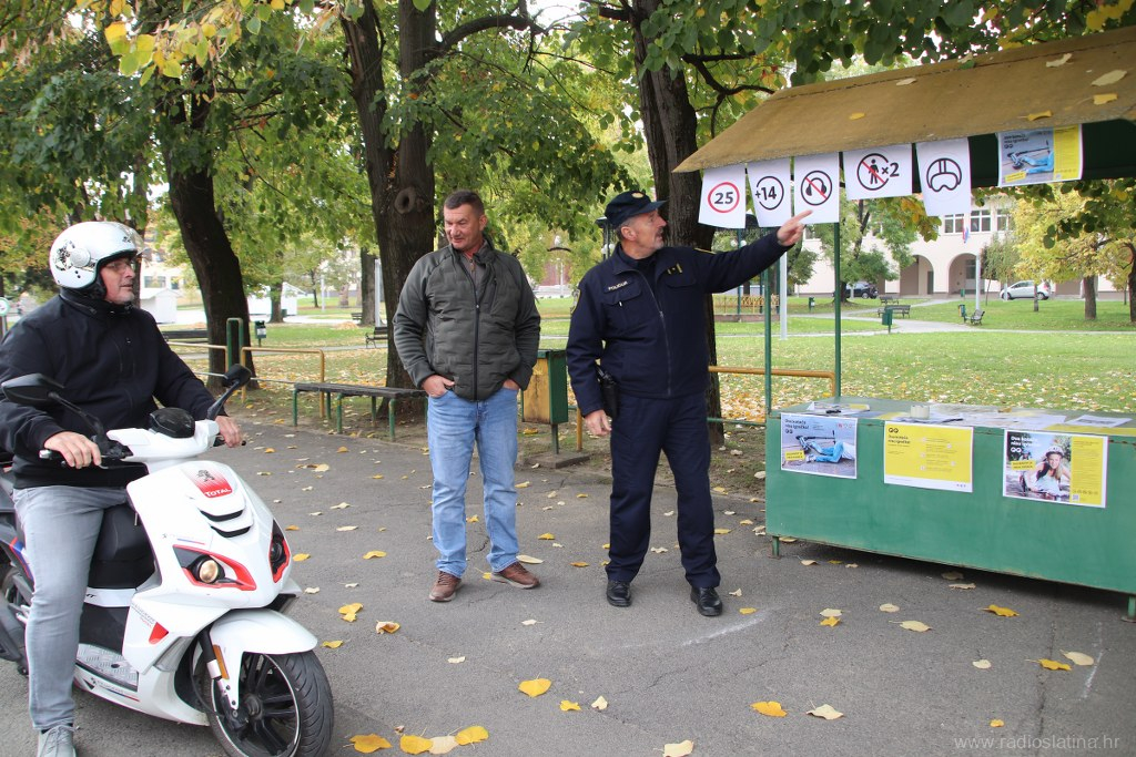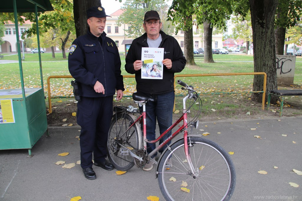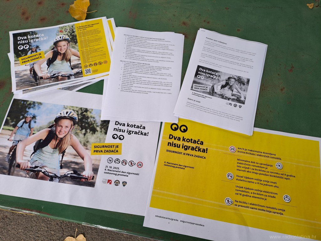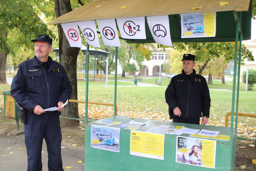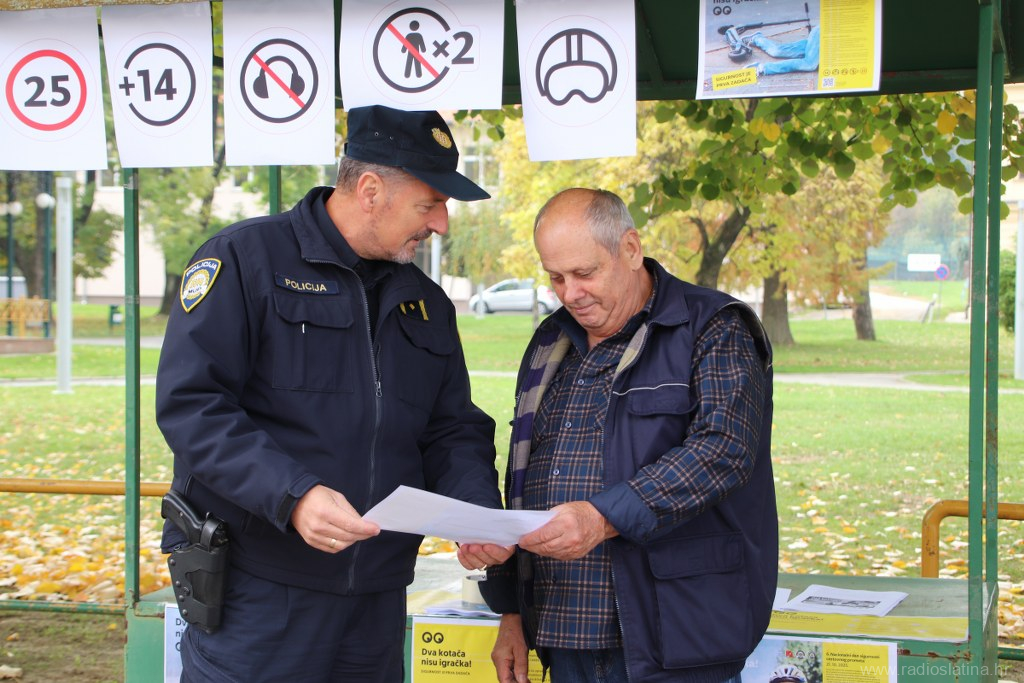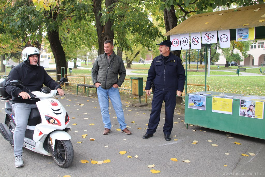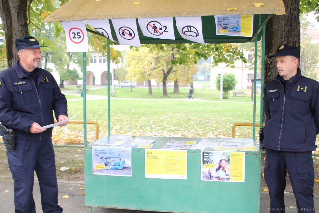 U sklopu nacionalne kampanje „Dva kotača nisu igračka! Sigurnost je prva zadaća“, povodom obilježavanja Nacionalnog dana sigurnosti cestovnog prometa, danas (utorak) su u Slatini ispred Parka 136. slatinske brigade, policijski službenici Policijske postaje Slatina, Kristijan Dlab i Stjepan Srednoselac, održali preventivno-edukativnu akciju s ciljem podizanja svijesti o sigurnosti u prometu, osobito među korisnicima električnih romobila i bicikala.