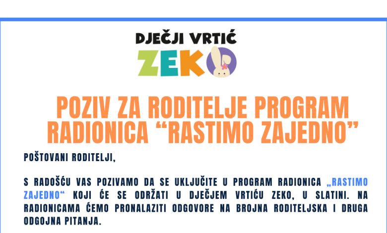 Poziv za roditelje – Program radionica “Rastimo zajedno” u Dječjem vrtiću Zeko