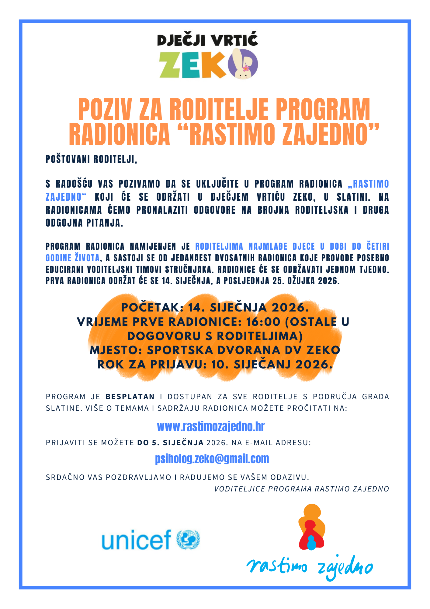 Pozivaju se roditelji s područja grada Slatine da se prijave na program radionica za roditelje „Rastimo zajedno” u Dječjem vrtiću Zeko. Program radionica „Rastimo zajedno“ razvijen je u suradnji s Unicefom, s osnovnim ciljem pružanja podrške roditeljima u odgoju djece. Program je namijenjen roditeljima najmlađe djece u dobi do četiri godine života.