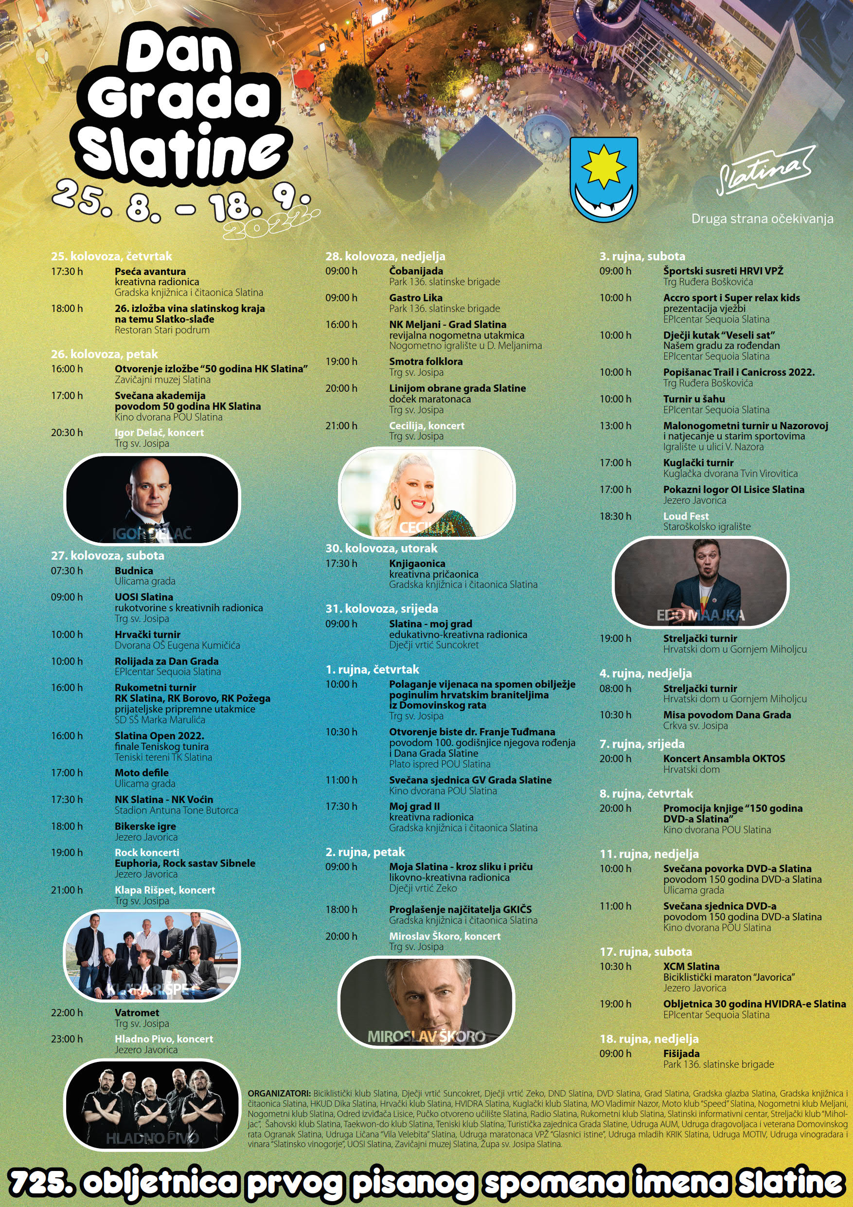 Povodom obilježavanja Dana grada Slatine, 1. rujna i 725. obljetnice prvog pisanog spomena imena Slatine, Grad Slatina, Slatinski informativni centar i Turistička zajednica Grada Slatine, pripremaju različite kulturno-zabavne manifestacije.