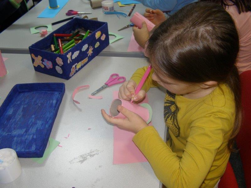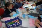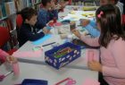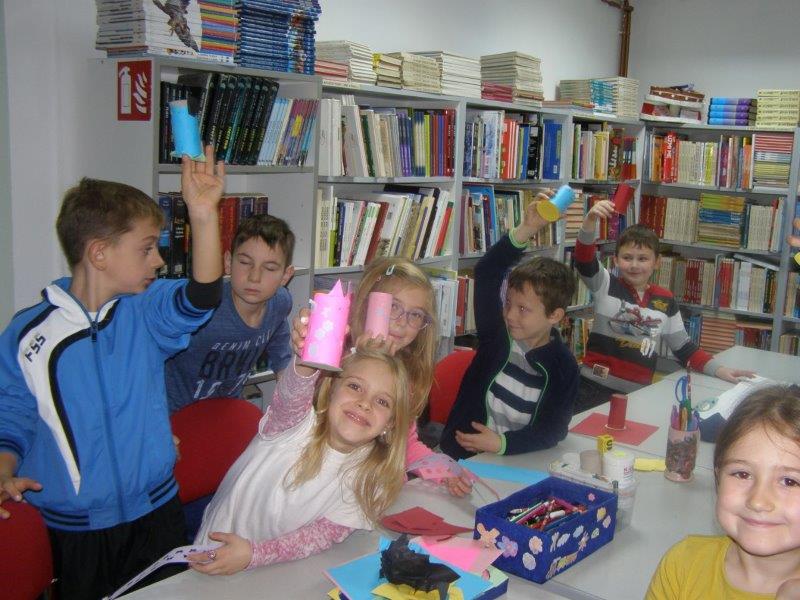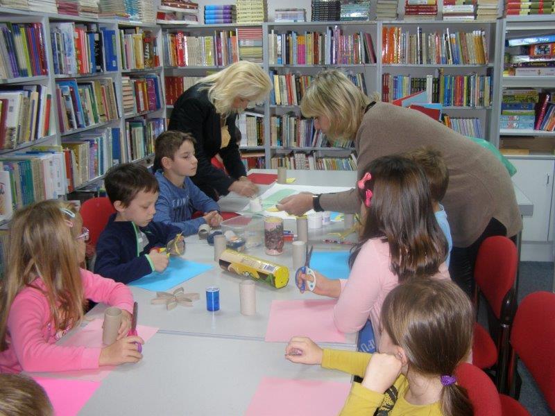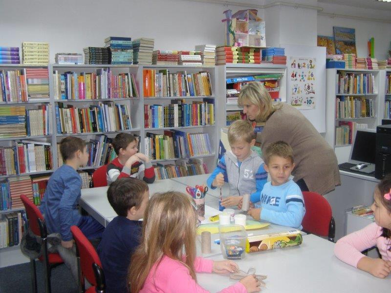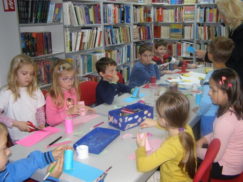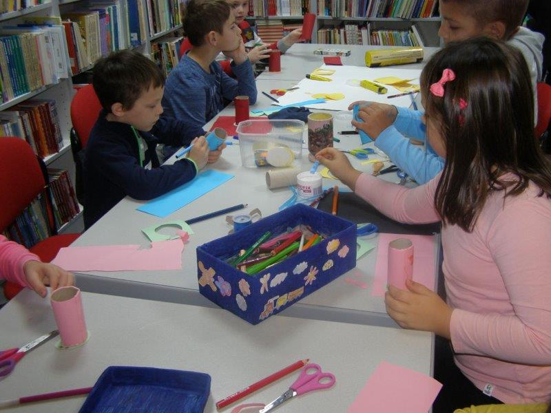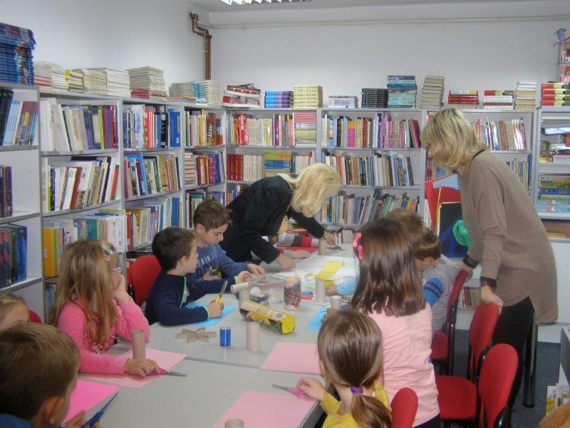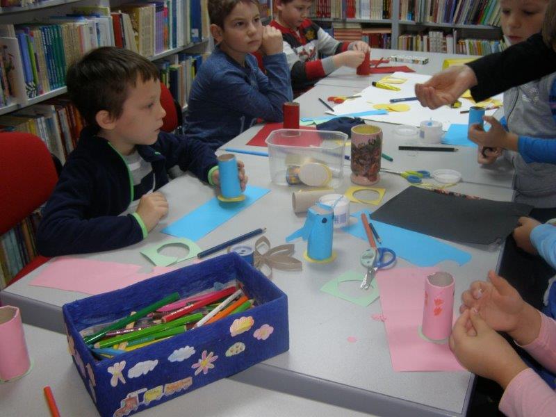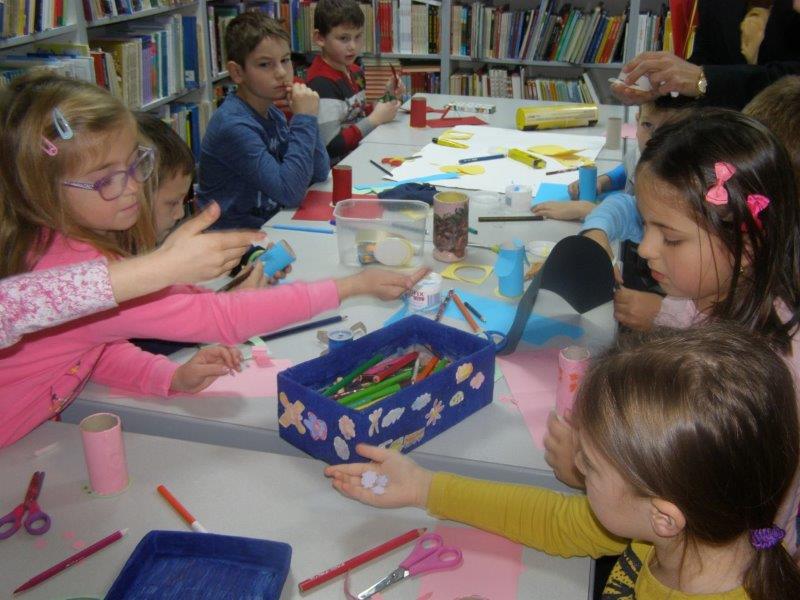 Nakon pričanja priča uslijedila je likovna radionica na kojoj su učenici, uz pomoć učiteljice i knjižničarke, od recikliranih materijala, izradili i ukrasili posudice u koje će odlagati ostatke nakon oštrenja olovki i bojica.