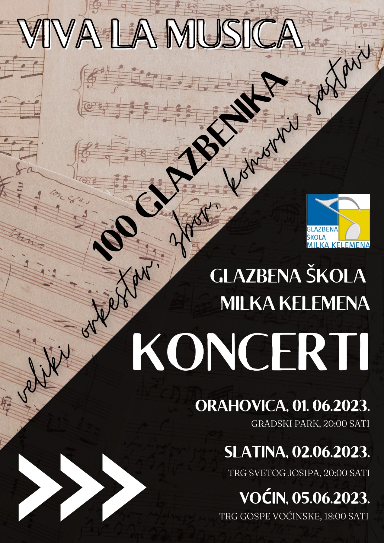 Prvi i najveći projekt Glazbene škole Milka Kelemena: Koncerti VIVA LA MUSICA u Orahovici, Slatini i Voćinu – 100 izvođača u velikom orkestru i zboru 1., 2. i 5. lipnja