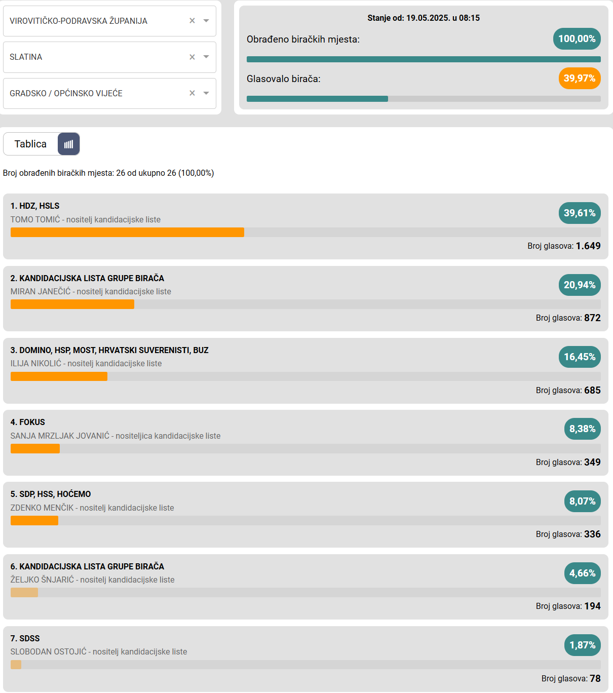 Prema sinoć objavljenim rezultatima Državnog izbornog povjerenstva za Grad Slatinu, što se tiče mjesta za gradonačelnika Grada Slatine ide se u drugi krug.