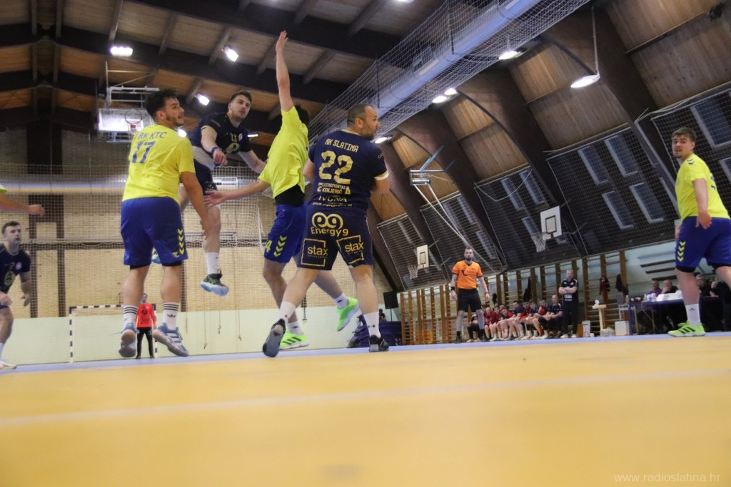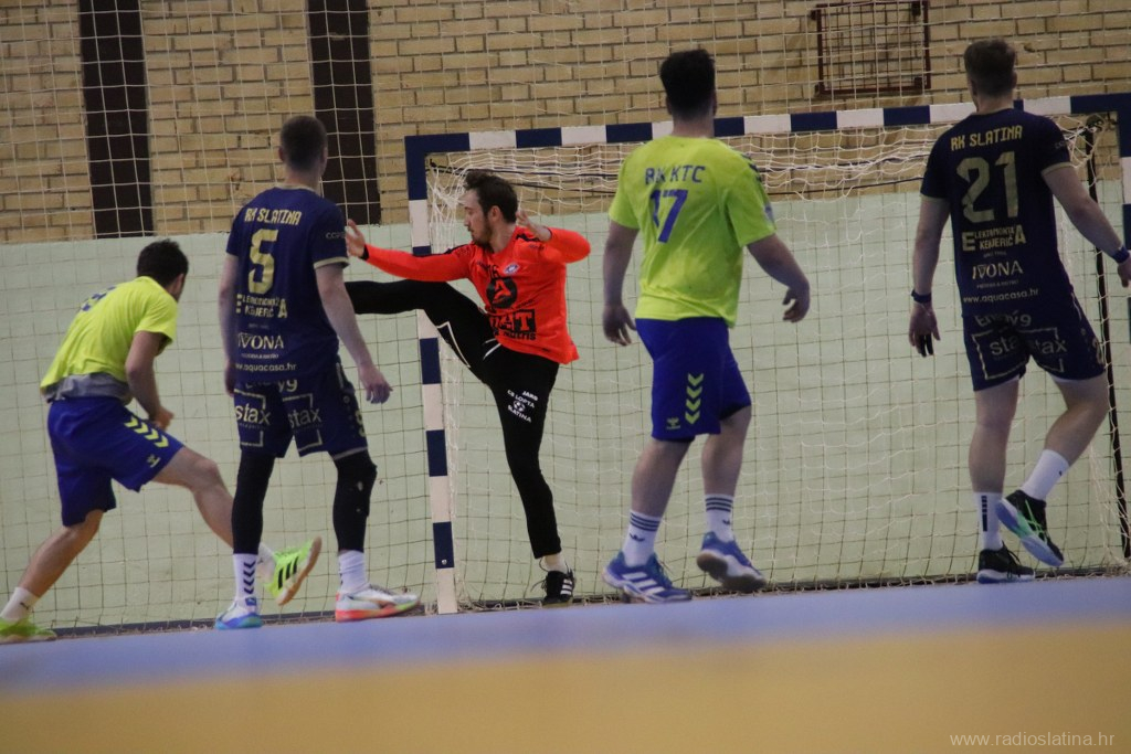 U posljednjoj domaćoj utakmici ove sezone, pred svojom publikom, rukometaši Slatine su se oprostili očekivanom i uvjerljivom pobjedom protiv posljednjeplasiranog KTC-a. Iako se prije početka susreta moglo pretpostaviti da će odlični Slatinčani imati određenih poteškoća u slamanju otpora mlade i poletne gostujuće ekipe, pogled na teren odmah je otkrio da će ovo biti susret revijalnog tona. Naime, gosti su doputovali na noge moćnom protivniku sa svega osam igrača, odnosno s osnovnom postavom i samo jednom zamjenom. Stvari su postale još jasnije kada je domaći trener Sokač pokazao da ništa ne prepušta slučaju, poslavši na teren svoje trenutno najjače snage, pa je bilo za očekivati sigurnu i laku pobjedu domaćina. Do odlaska na odmor prednost je iznosila osam pogodaka, no u nastavku je došlo do očekivanog “otpuštanja gasa” u domaćim redovima. To su iskoristili hrabri gosti koji su drugi dio utakmice čak dobili s jednim golom prednosti, na čemu im svakako treba čestitati.