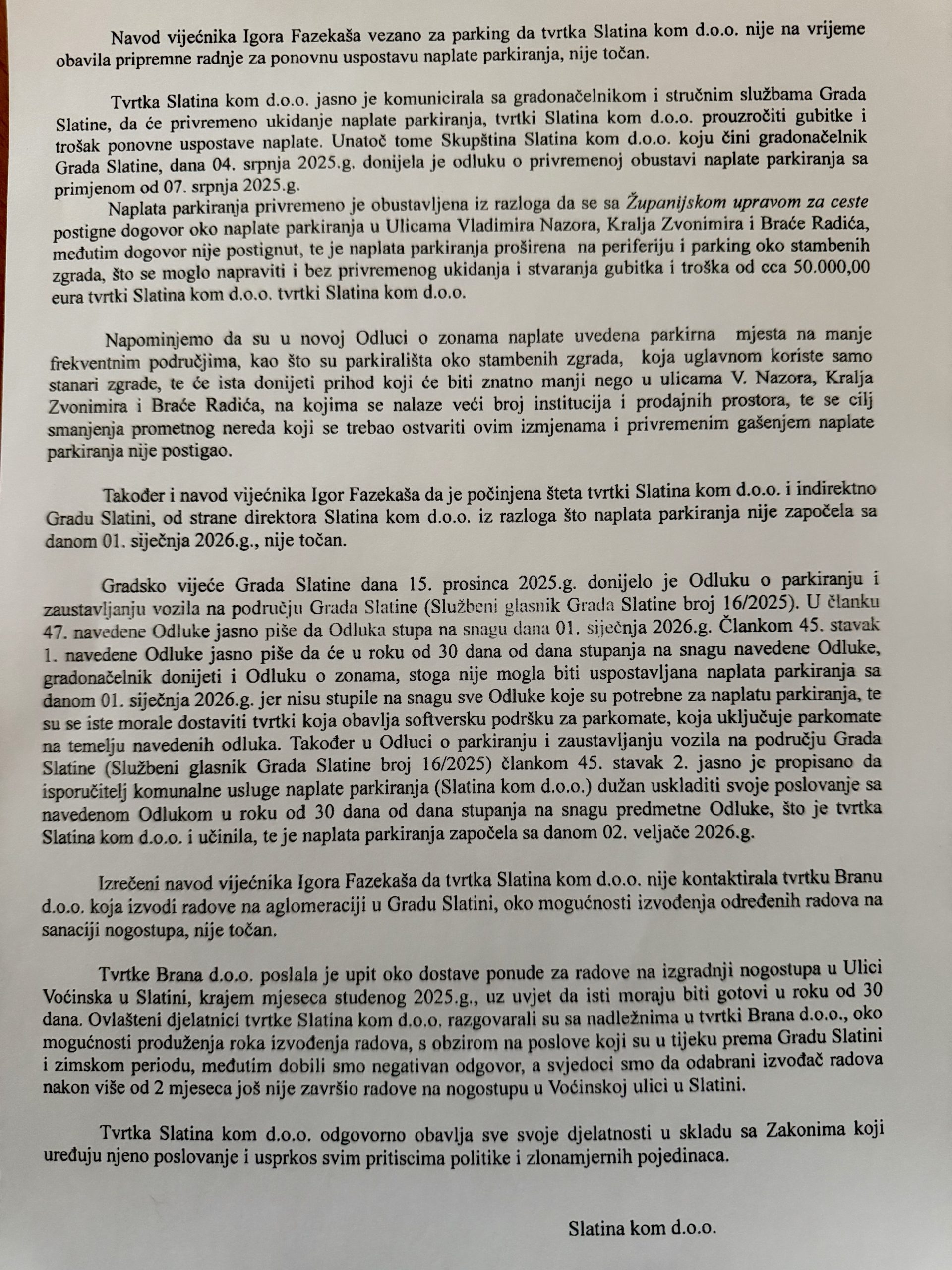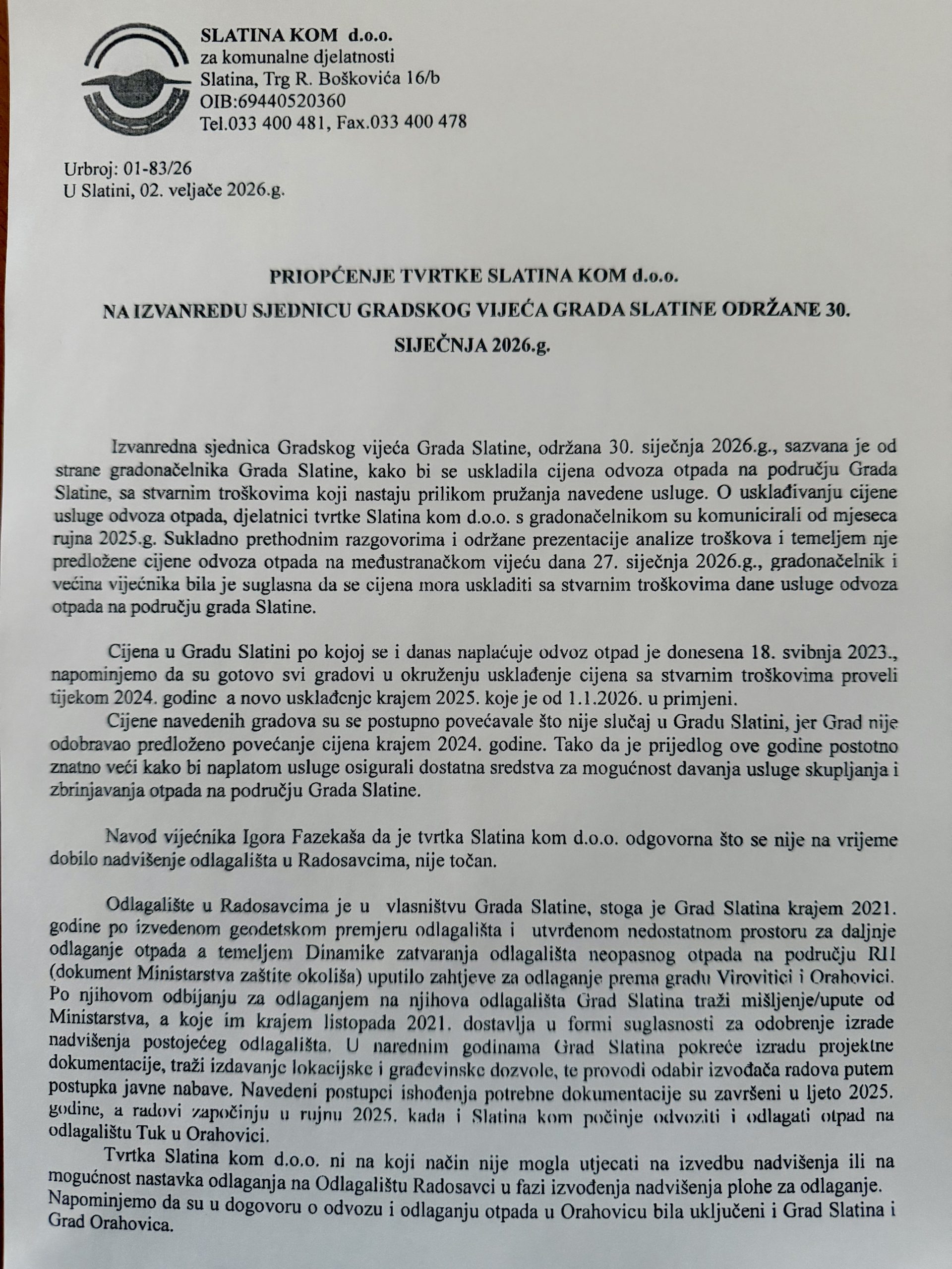 Tvrtka Slatina kom d.o.o. Slatina oglasila se s priopćenjem za javnost vezanim uz izvanrednu sjednicu Gradskog vijeća Grada Slatine održane 30. siječnja 2026. g.