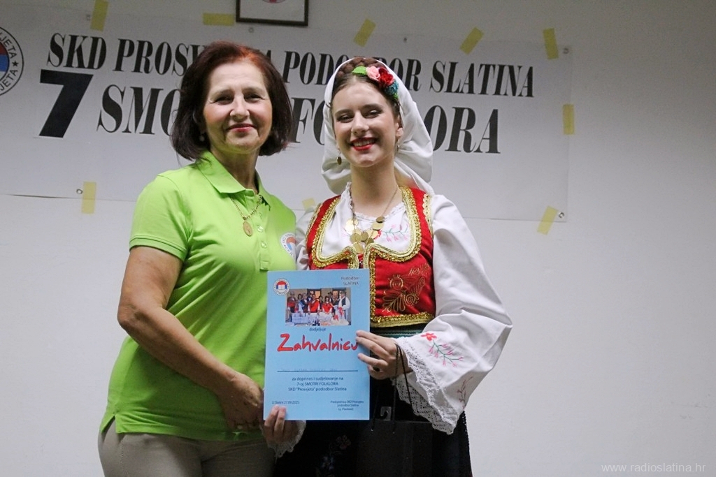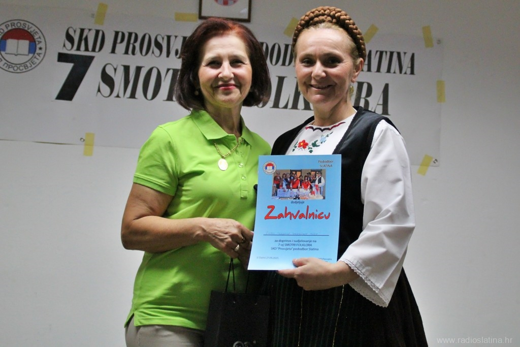 Na početku programa sve nazočne je pozdravila predsjednica slatinskog Pododbora Ljubinka Pavlović, koja je izrazila posebnu dobrodošlicu članovima gostujućih kulturno-umjetničkih društava. Istaknula je kako je SKD „Prosvjeta“ Slatina, osnovana 2016. godine, prepoznata po nastojanjima da očuva i prenese bogato naslijeđe Slavonije i šire, a upravo su smotre folklora prilika da se prikaže raskoš narodnih nošnji, pjesme, plesovi i običaji.