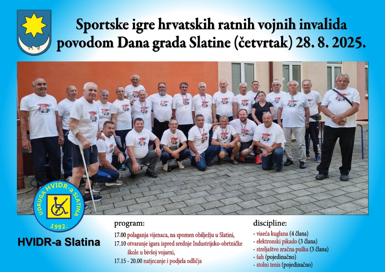 U povodu obilježavanja Dana grada Slatine, danas će se održati Sportske igre hrvatskih ratnih vojnih invalida, u organizaciji Udruge HVIDR-a Slatina, a pod pokroviteljstvom Grada Slatine.