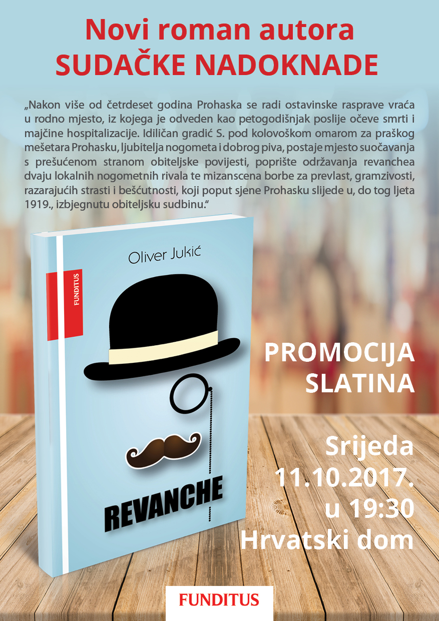 U srijedu, 11. listopada bit će održana promocija novog romana Olivera Jukića “Revanche”. Što o romanu ima za reći sam autor poslušajte od 19.30 sati u dvorani Hrvatskog doma u Slatini.