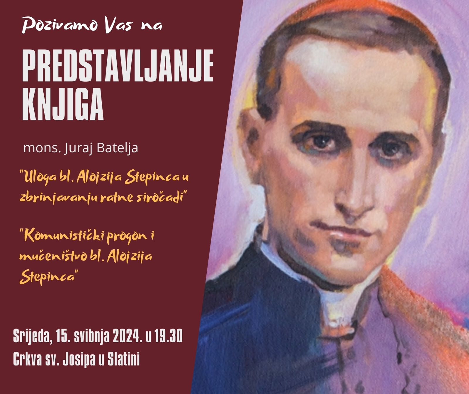 U srijedu, 15. svibnja u župnoj crkvi sv. Josipa u Slatini s početkom u 19:30 sati održat će se predstavljanje knjiga dr. sc. mons. Jurja Batelje koji vodi slučaj za proglašenje svetim kardinala Alojzija Stepinca.
