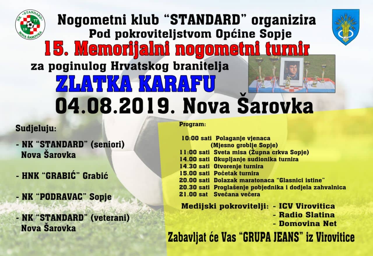 Nogometni klub Standard iz Nove Šarovke, pod pokroviteljstvom Općine Sopje, u nedjelju, 4. kolovoza, organizira 15. Memorijalni nogometni turnir u sjećanje na poginulog hrvatskog branitelja Zlatka Karafu.