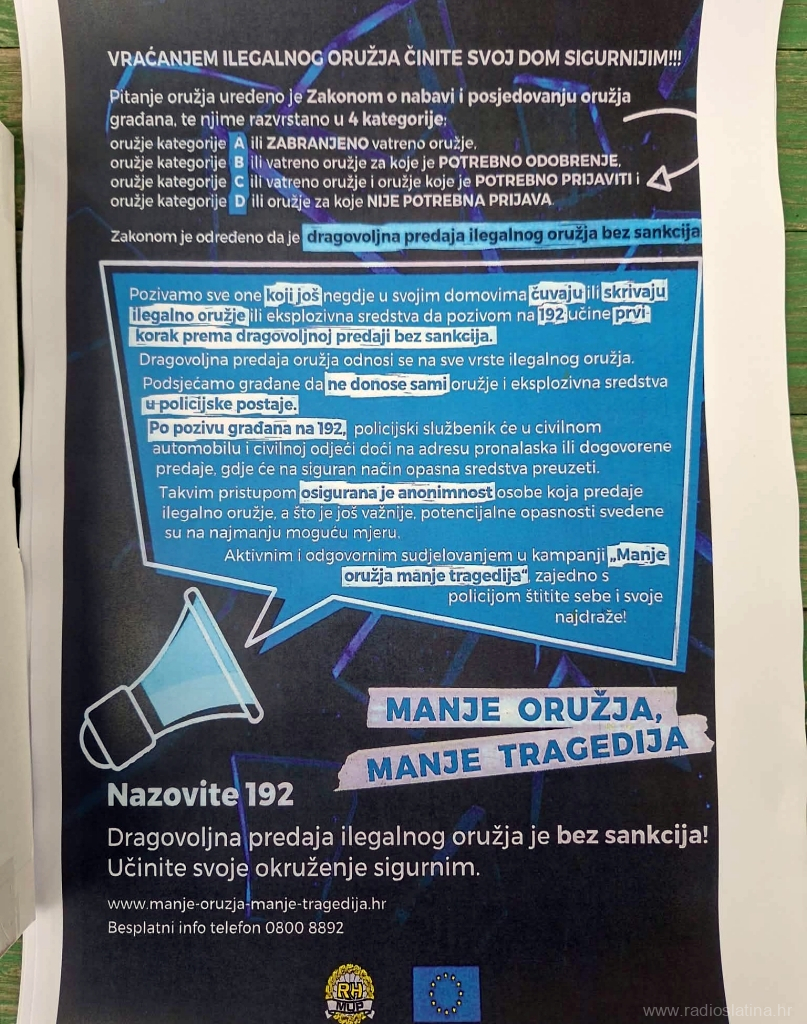 Policijska uprava virovitičko-podravska tijekom prosinca, u sklopu operativne akcije “Mir i dobro”, provodi kampanju “Manje oružja, manje tragedija” kojoj je cilj dodatno potaknuti građane na dragovoljnu predaju ilegalnog oružja, utjecati na podizanje svijesti javnosti o opasnostima od nestručnog rukovanja oružjem i minsko-eksplozivnim sredstvima, kao i na osvješćivanje da manje oružja doista znači i manje tragedija.