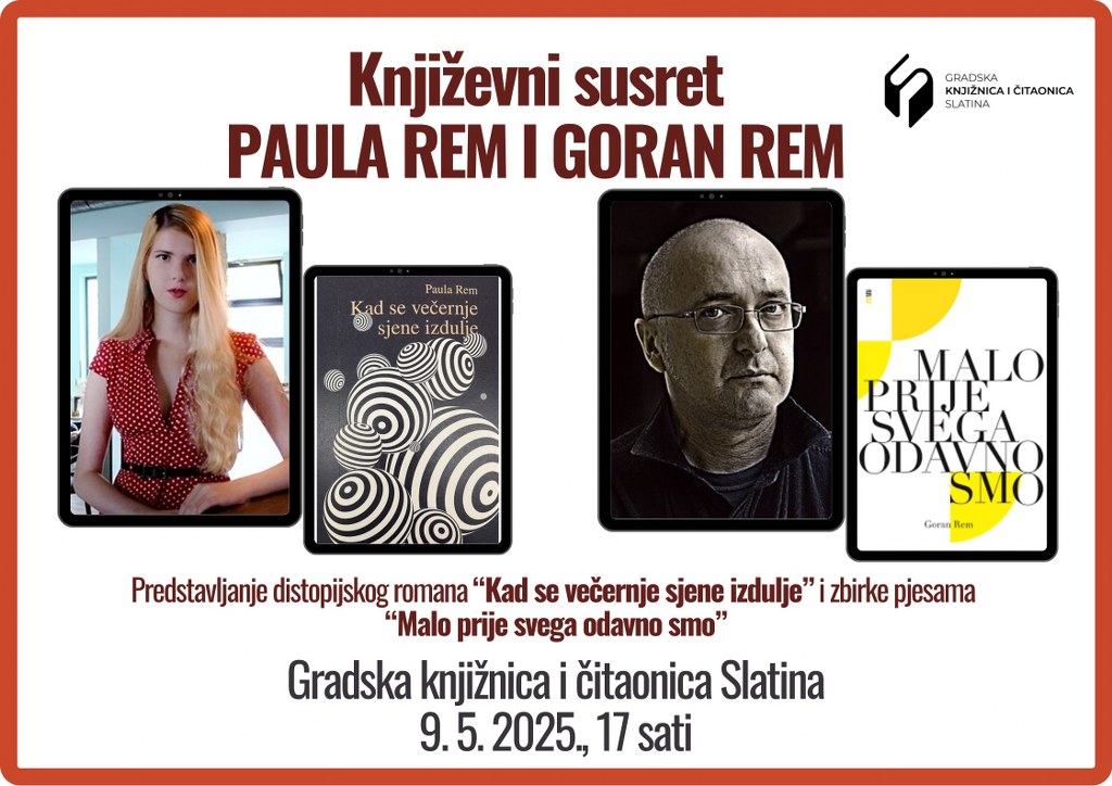 Gradska knjižnica i čitaonica Slatina u petak, 9. svibnja priprema književni susret s početkom u 17 sati.