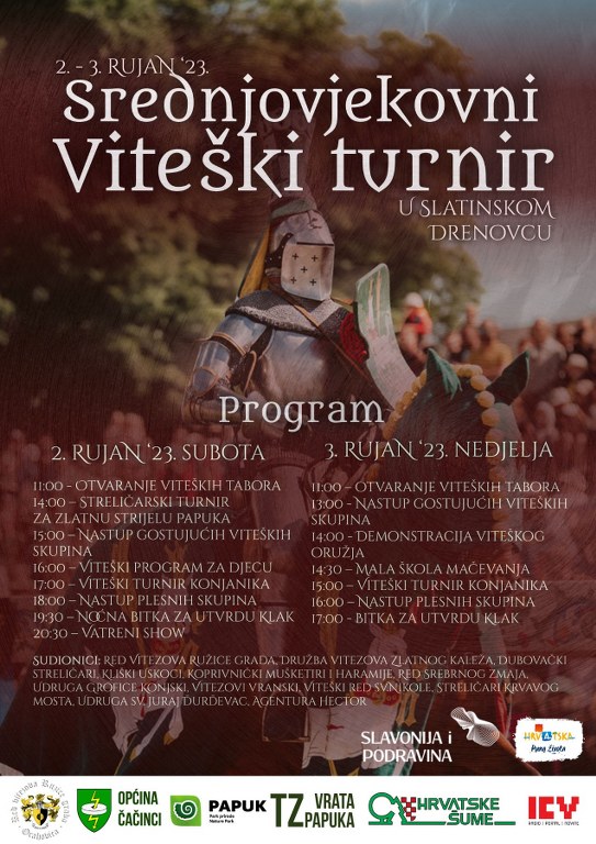 Tako smo doznali kako će se Viteški turnir ove godine po prvi puta održati „na vratima Papuka“, odnosno na livadi uz potok u Slatinskom Drenovcu 2. i 3. rujna u organizaciji Javne ustanove Park prirode Papuk, Turističke zajednice Vrata Papuka, Općine Čačinci i Udruge Red vitezova Ružice grada.