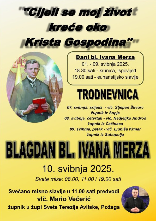 Obilježavanje blagdana bl. Ivana Merza nastavlja se trodnevnicom bl. Ivanu Merzu koja započinje danas, 7. svibnja svetom misom koju će u crkvi bl. Ivana Merza u Slatini služiti župnik iz Sopja, vlč. Stjepan Škvorc.