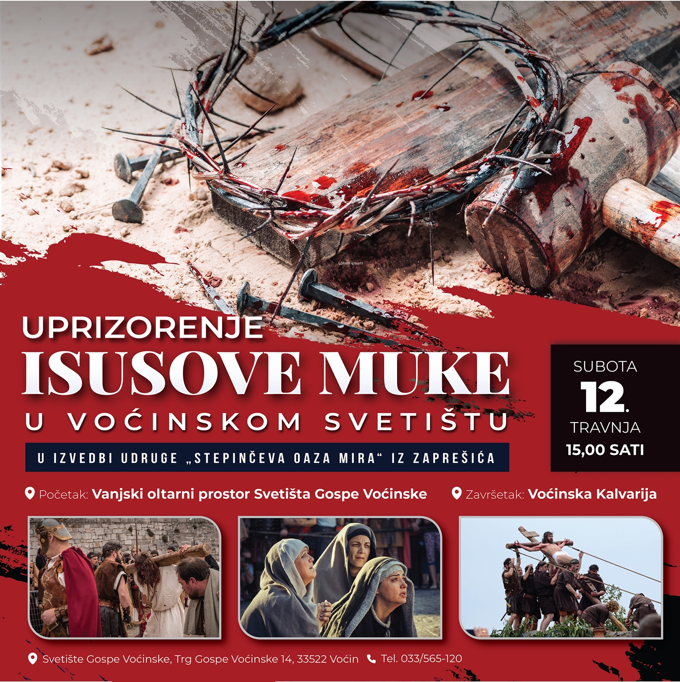 U Svetištu Gospe Voćinske u subotu, 12. travnja 2025. godine održat će se uprizorenje Isusove muke.