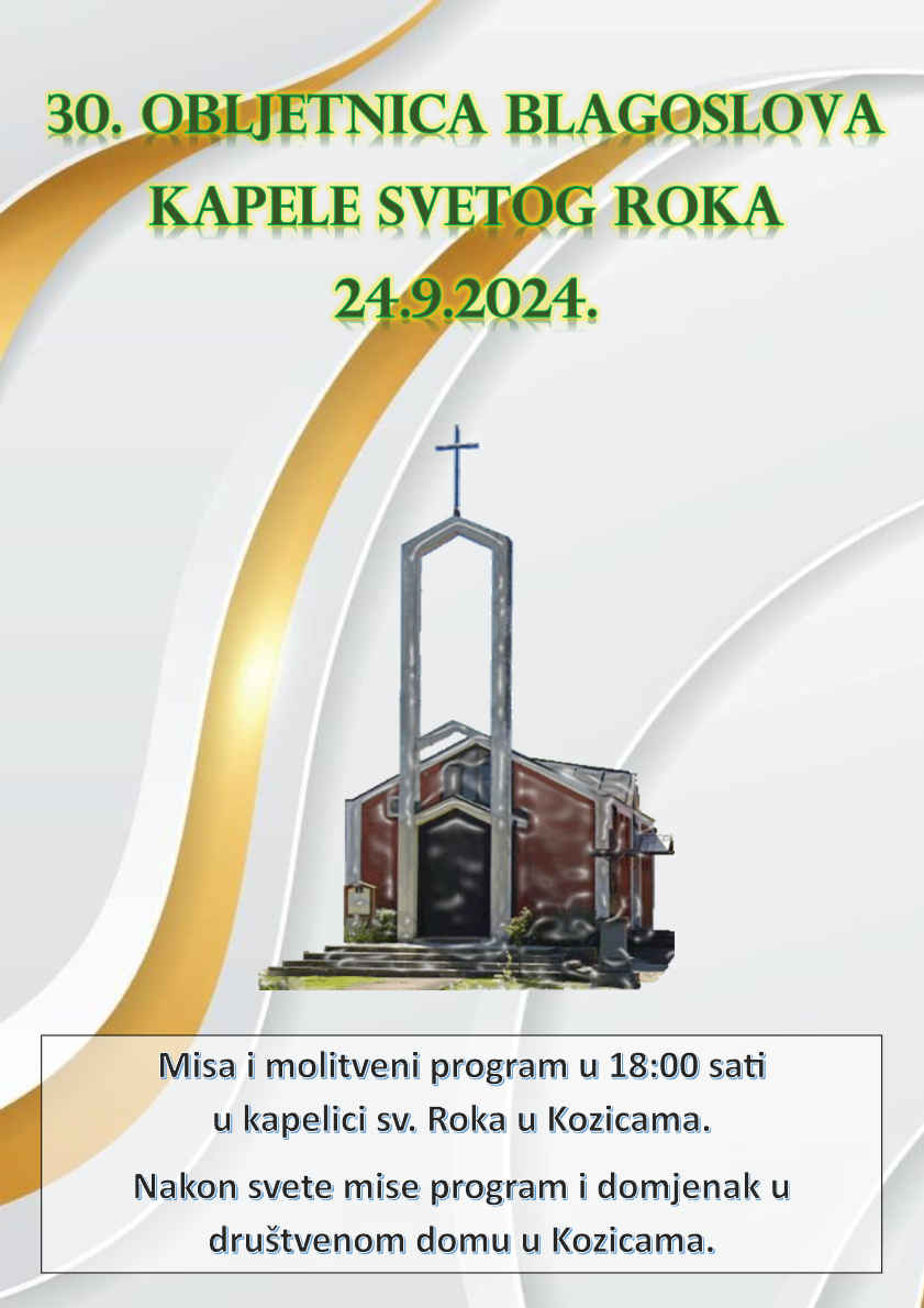 Vijeće Mjesnog odbora Kozice poziva Vas na svečano obilježavanje 30. obljetnice blagoslova kapele sv. Roka u Kozicama.