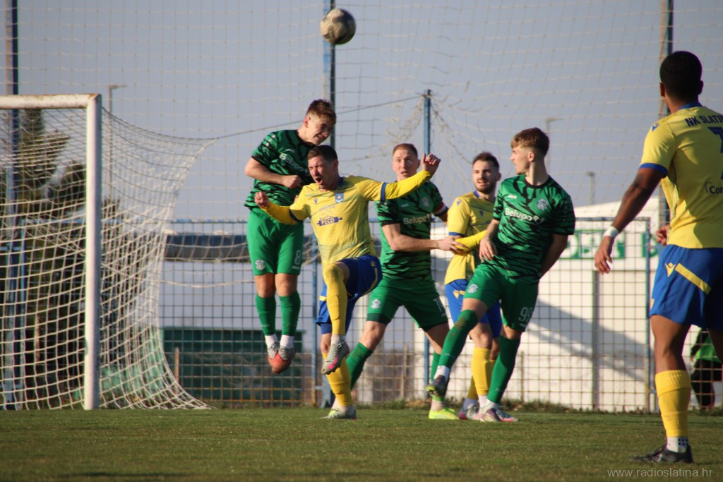 Prva zrela prigoda stigla je u 7. minuti za domaćine no nesebična asistencija Kupresa za Bubaša bila je tek mrvicu prejaka. Uzvratili su gosti u 15. minuti preko Škoje no njegovu bombu s dvadesetak metara atraktivno je ispod grede iščupao Embrešić. Samo dvije minute kasnije Hrahovski je potegao još snažnije no više iskosa, a lopta je, nakon što ju je vršcima prstiju dotaknuo vratar Slatine, zatresla vratnicu. Praktički u istoj minuti na drugoj strani terena Pecolaj lukavo podvaljuje za Bubaša, a isti tuče snažno, ali i neprecizno. I onda u trećoj minuti nadoknade prvog dijela iz skraćenog kornera Slatina dolazi do vodstva. Pecolaj je ubacio oštro na prvu vratnicu gdje je najbrži i najsnalažljiviji Denis Petrinjak.