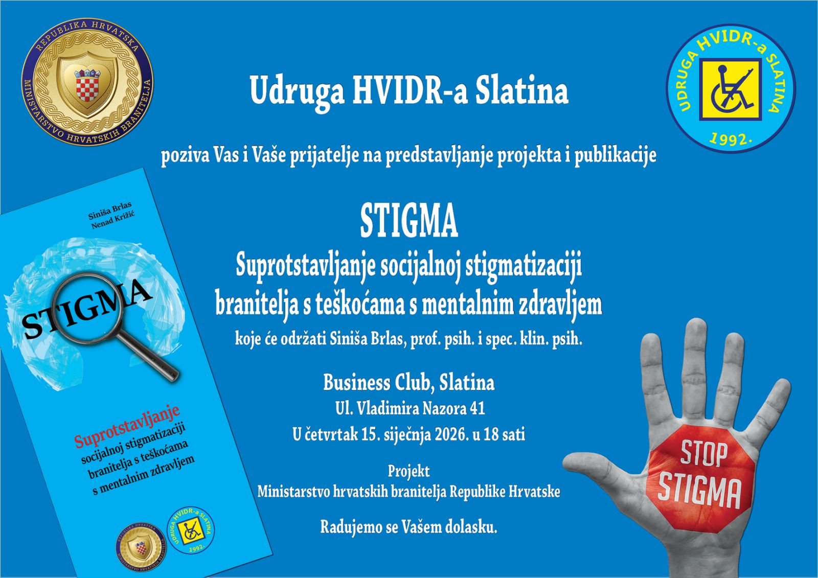U sklopu događanja bit će predstavljena istoimena publikacija, a o temi socijalne stigmatizacije branitelja s mentalnim poteškoćama govorit će Siniša Brlas, prof. psihologije i specijalist kliničke psihologije. Projekt se provodi uz potporu Ministarstva hrvatskih branitelja Republike Hrvatske.