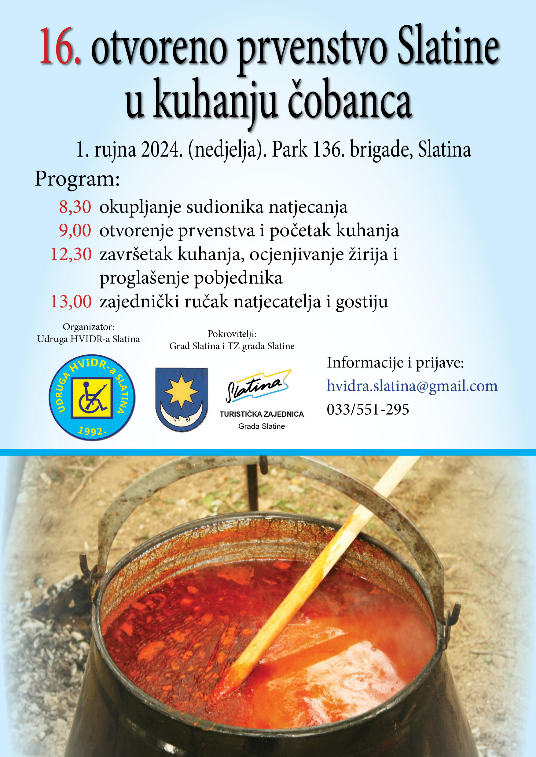 U želji da mirisi i okusi Slavonije zagospodare našom Slatinom 1. rujna 2024. godine, i sa nadamo da ćete i Vi odvažiti prezentirati svoje kulinarske vještine uz kuhaču sa ostalim natjecateljima i biti dio okupljanja uz kotlić slatinčana i njihovih gostiju dobro došli !