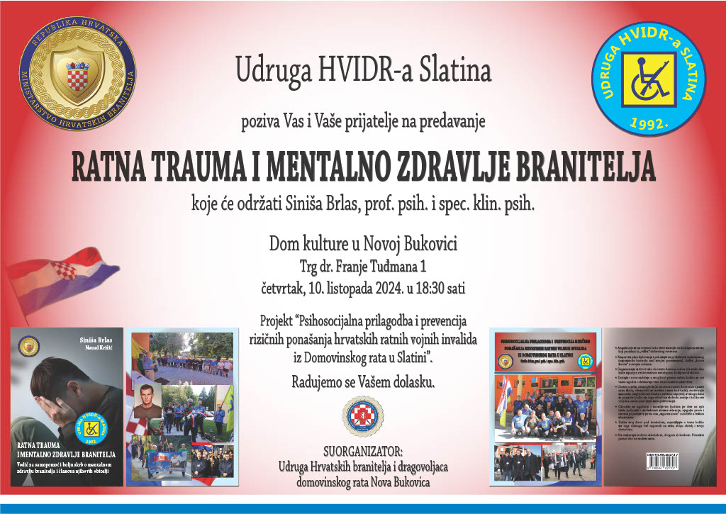Udruga HVIDR-a Slatina poziva na predavanje „Ratna trauma i mentalno zdravlje branitelja“ u četvrtak, 10. listopada
