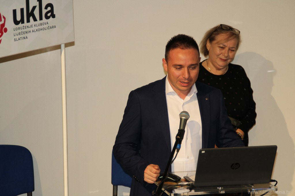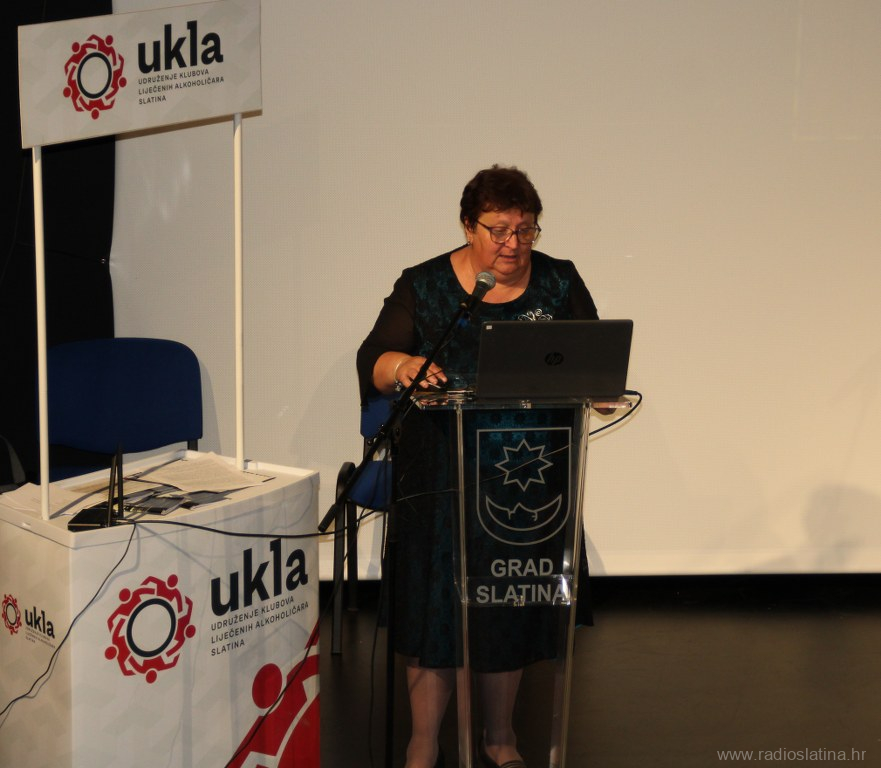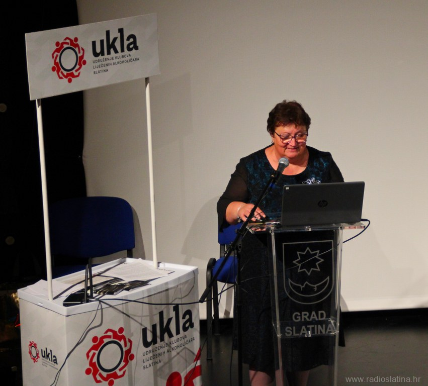 Pozdravila je brojne uzvanike, među kojima posebno prof. dr. Zorana Zoričića, predsjednika Hrvatskog saveza klubova liječenih alkoholičara, Alena Dedija, dopredsjednika, prim. Antu Oreškovića, te gradonačelnika Slatine Tomu Tomića, kojemu je upućena posebna zahvala za podršku radu Udruge.