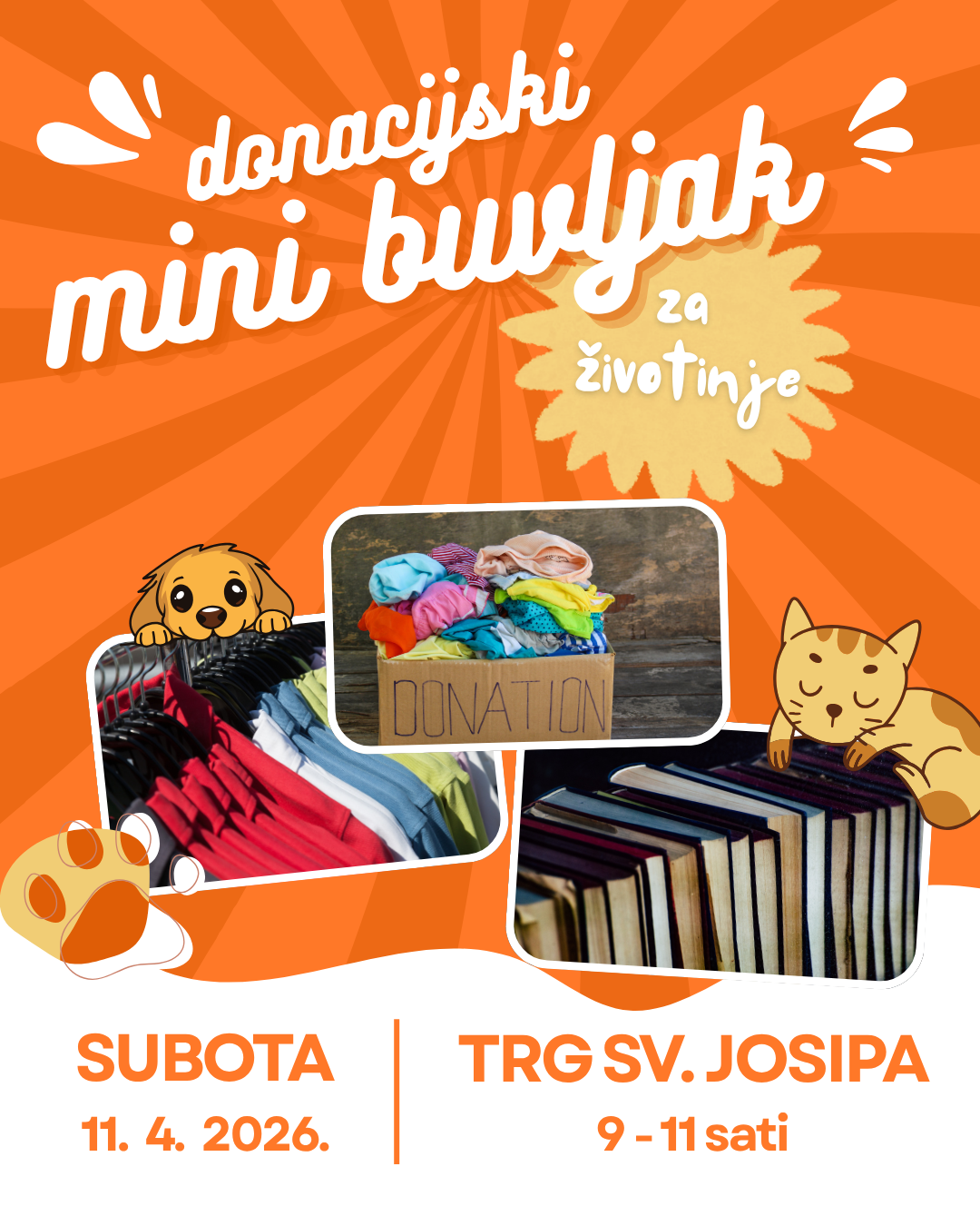 Udruga za zaštitu životinja „Zakon šape“ najavila je održavanje donacijskog mini buvljaka koji će se održati ove subote, 11. travnja, na Trgu sv. Josipa u Slatini. Štand udruge bit će postavljen ispred parka u vremenu od 9 do 11 sati, a građani će imati priliku izravno podržati rad volontera i pomoći napuštenim životinjama.