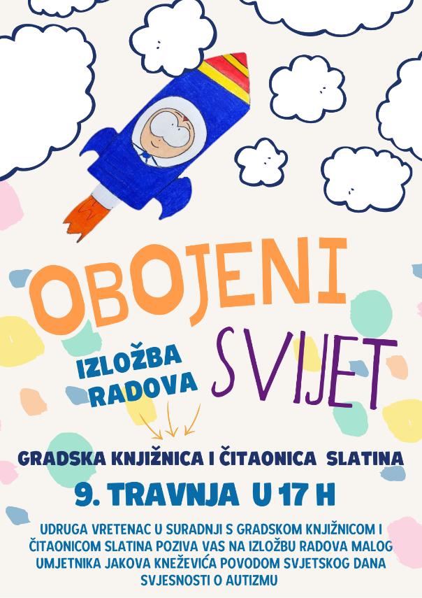 Udruga osoba s intelektualnim teškoćama “Vretenac Slatina”, u partnerstvu s Gradskom knjižnicom i čitaonicom Slatina, s ponosom predstavlja izložbu radova malog umjetnika Jakova Kneževića, dječaka koji s velikom strašću stvara unutar autističnog spektra najljepša likovna djela. Pod nazivom “OBOJENI SVIJET”, ova izložba će zasigurno oživjeti naše dane bojama i radosti!