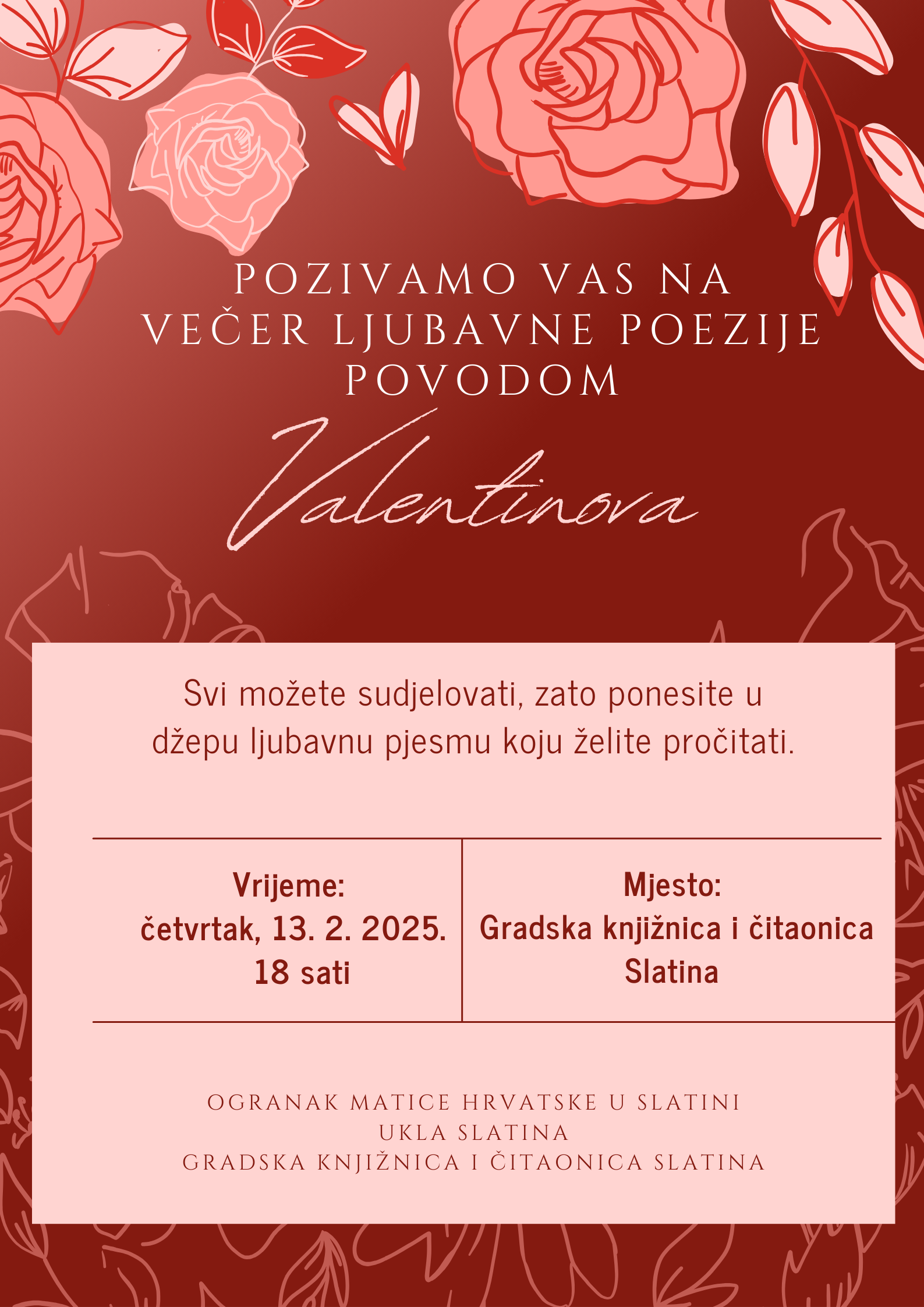 Gradska knjižnica i čitaonica Slatina, Ogranak Matice hrvatske u Slatini i UKLA Slatina pozivaju sve građane na večer ljubavne poezije posvećene Valentinovu – danu zaljubljenih.