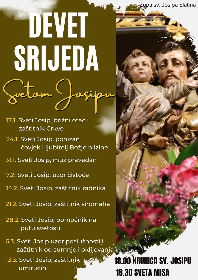 U susret ovogodišnjoj svetkovini sv. Josipa 19. ožujka kada grad Slatina i Župa sv. Josipa slave svog zaštitnika, u srijedu, 17. siječnja započinje Velika devetnica sv. Josipu, čuvaru Crkve.