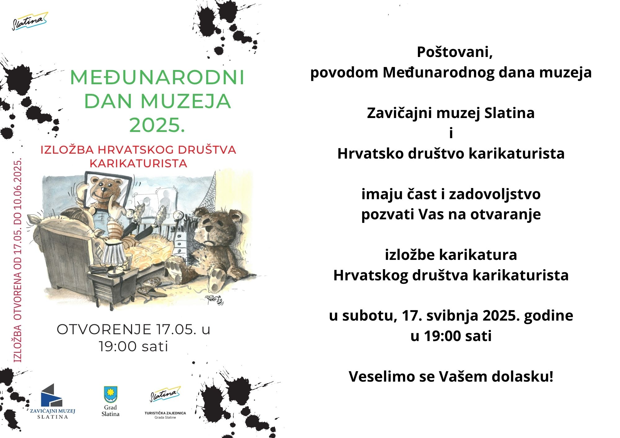 Svečano otvorenje izložbe karikatura Hrvatskog društva karikaturista održat će se u Zavičajnom muzeju Slatina u subotu, 17. svibnja s početkom u 19 sati.