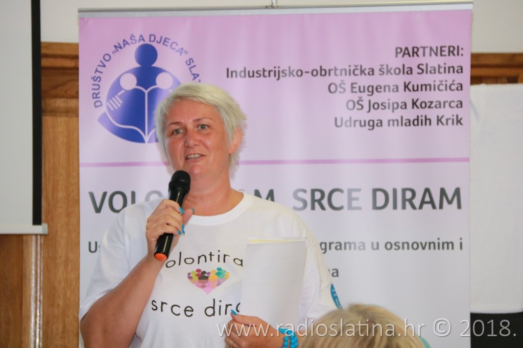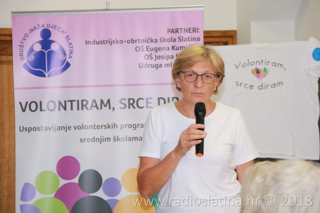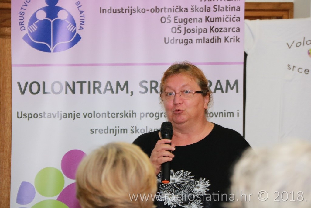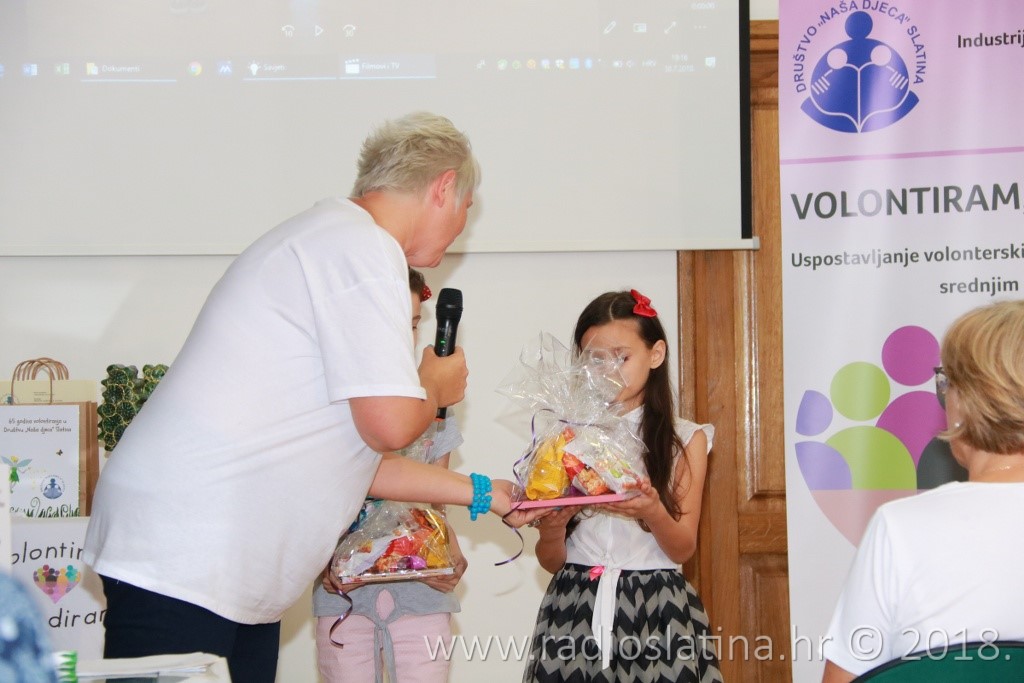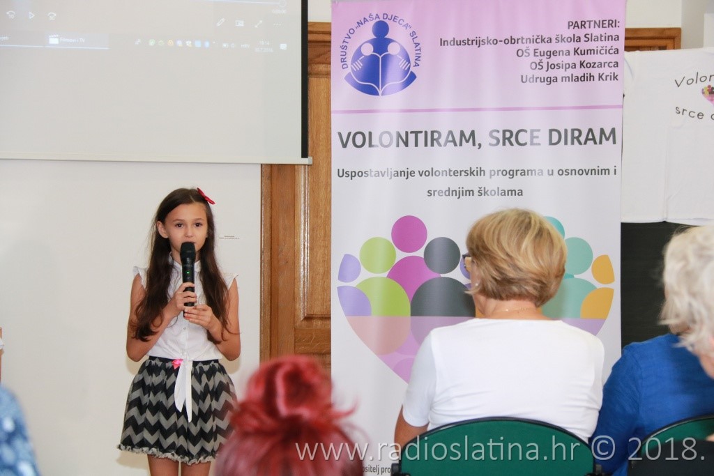 Provedbu projekta, čiji idejni začetnik je Jasenka Plantak iz Udruge mladih „KRIK“, predstavila je kratkom prezentacijom njegova koordinatorica Julijana Pavlešić. Prema njezinim riječima, projekt je sadržavao niz aktivnosti: osnivanje 3 volonterska kluba i edukaciju 45 učenika u školama partnerima, edukaciju voditelja volonterskih klubova, radionice „upcyclinga“, organiziranje volontera za vršnjačku pomoć, organiziranje volontera za volontiranje u domu za starije i nemoćne, organiziranje volonterskih akcija prema idejama učenika, uključivanje šire zajednice u akciju „Hrvatska volontira“, izložbu radova, izradu monografije “65 godina volontiranja u Društvu Naša djeca Slatina”….